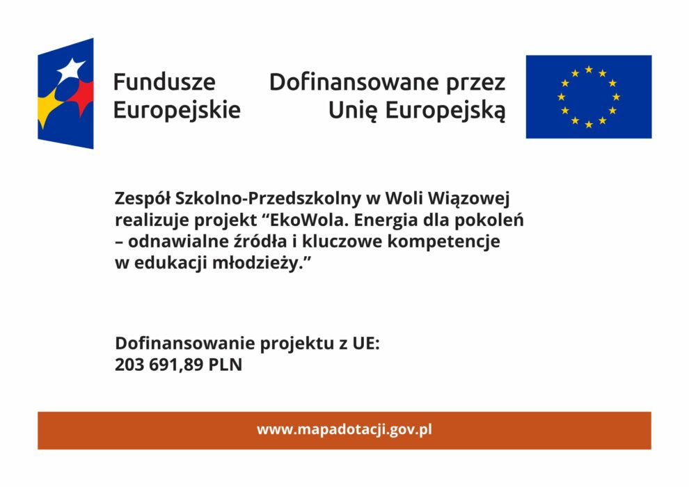 Projekt „EkoWola. Energia dla pokoleń – odnawialne źródła i kluczowe kompetencje w edukacji młodzieży” uzyskał dofinansowanie z Unii Europejskiej w wysokości 203 691,89 zł.