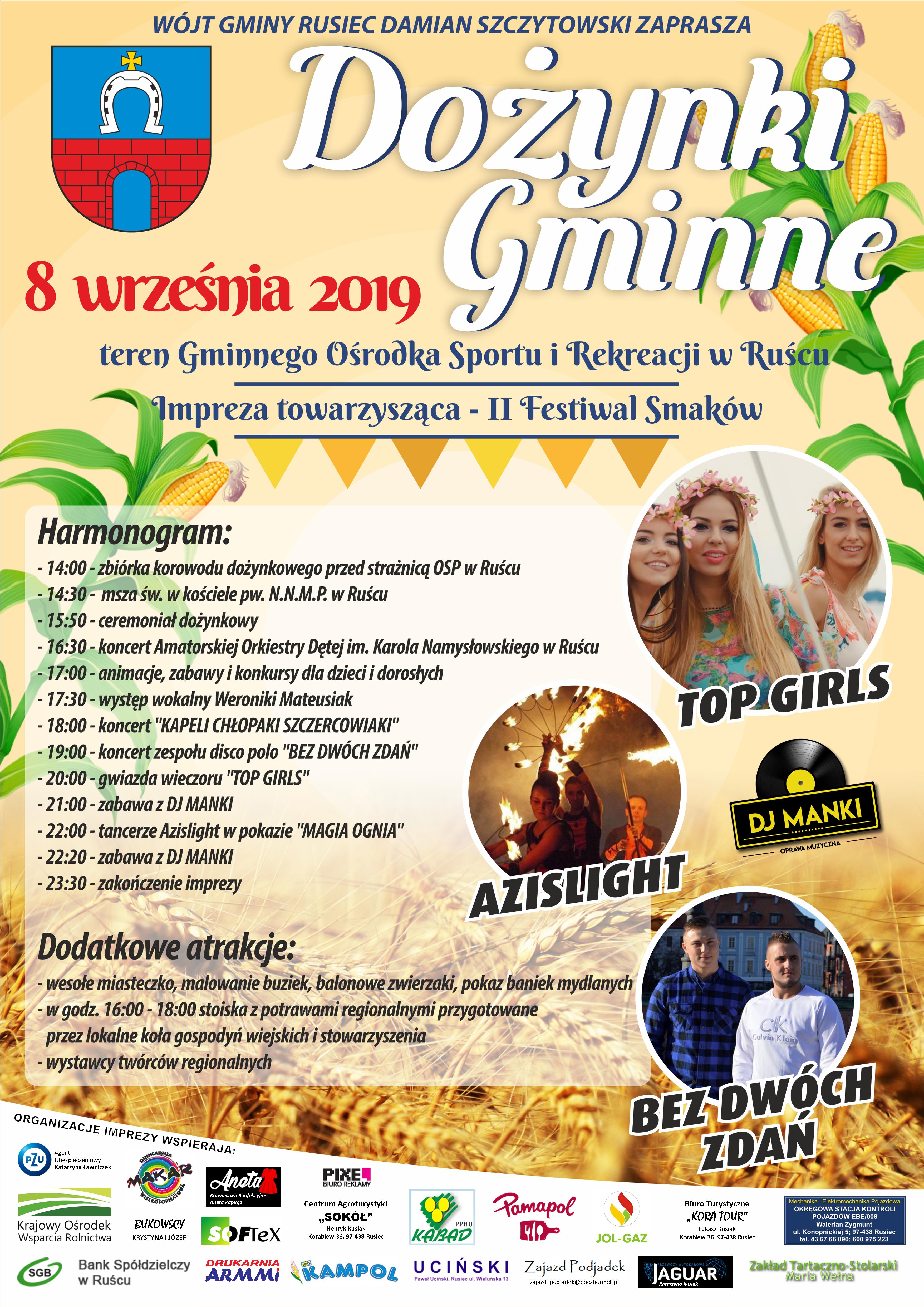Z ogromną przyjemnością pragnę Państwa zaprosić na Dożynki Gminne oraz II Festiwal Smaków w Ruścu, które odbędą się w dniu 8 września 2019r. Corocznie organizowane w Gminie Rusiec święto plonów to już tradycja. Jest zwieńczeniem całego roku ciężkiej pracy rolników. W tym roku imprezą towarzyszącą będzie II Festiwal Smaków. Koła gospodyń wiejskich z terenu gminy Rusiec zaprezentują swe umiejętności, dzięki czemu udamy się w „kulinarną podróż” kosztując wyjątkowych dań z czasów naszych dziadków i pradziadków. Pragniemy, aby ten dzień zapadł w Państwa pamięci jako wyjątkowy, pełen lokalnych tradycji, dobrej zabawy w przyjaznej i rodzinnej atmosferze.