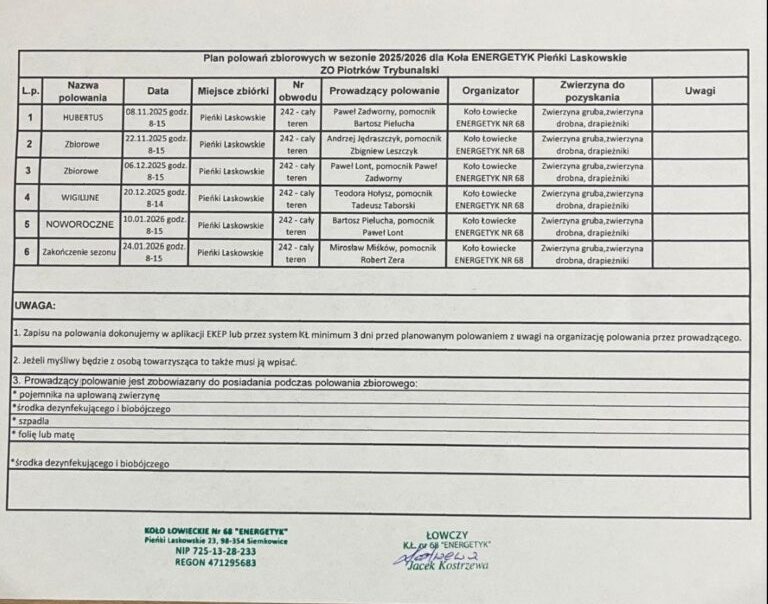 Kalendarz polowań zbiorowych Koła Łowieckiego „ Energetyk” w sezonie 2025/2026